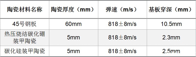 测试中,采用空白靶最对比,85式7.62毫米狙击步枪对45号钢的垂直侵彻深度为10.5mm,以此作为陶瓷复合装甲的抗弹性能评判标准。对热压碳化硼装甲片、碳化硅装甲片进行抗弹性能进行评估。