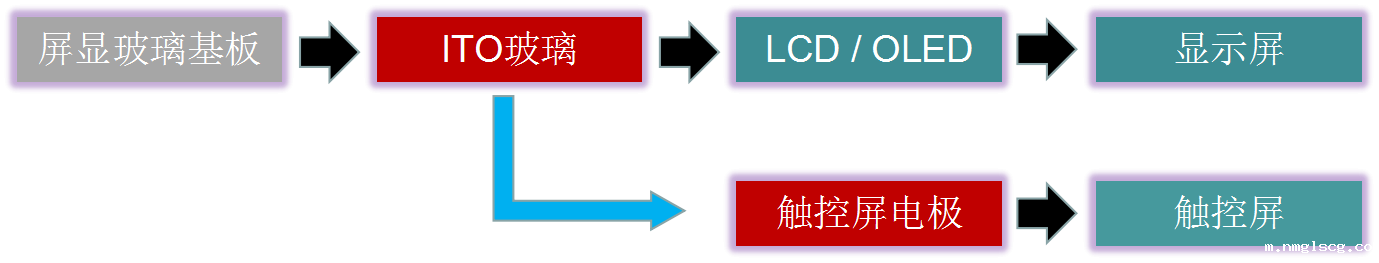 ITO下游产业主要是平板显示产业中的导电玻璃技术,即在钠钙基或硅硼基基片玻璃的基础上,镀上一层氧化铟锡膜加工制作成的。在平板显示产业中应用在触摸屏和液晶面板领域。触摸屏领域应用的是TP-ITO导电玻璃,而液晶面板领域应用的是LCD-ITO导电玻璃,两者的主要区别在LCD-ITO导电玻璃还会在镀ITO层之前,镀上一层二氧化硅阻挡层,以阻止基片玻璃上的钠离子向盒内液晶里扩散。