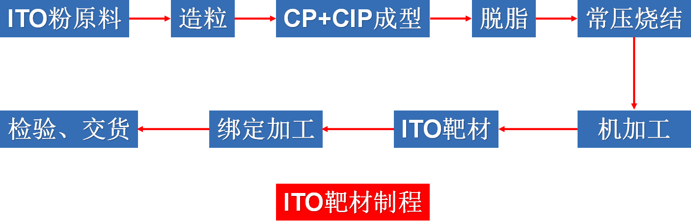其专利 高纯高密度ITO靶材的制备方法:将自制的ITO粉加纯水配制成浆料,之后加入分散剂,在砂磨机中砂磨,之后加入粘结剂和消泡剂进行球磨,再经喷雾造粒得到ITO造粒粉;将得到的ITO造粒粉装入模具中预压成型得到ITO初坯;将得到的ITO初坯在冷等静压机上成型得到ITO素坯;将得到的ITO素坯在脱脂炉中脱脂,之后再在通氧气氛的烧结炉中烧结,即得到高纯高密度的ITO靶材。